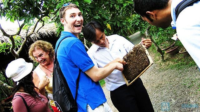 Then stop to visit home-made products as: pop-rice, rice-paper, coconut candy producing… Taste some honey tea, snake wine…